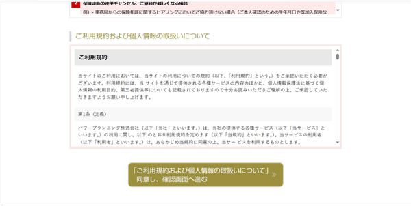 入力が終わったら、「注意事項の確認」「利用規約に同意」にチェックを入れて、確認画面に進みます。