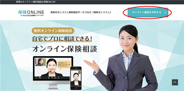 みんなの保険アドバイザーの無料相談の申し込みは、まず右上の「オンライン面談を予約する」をクリックします。