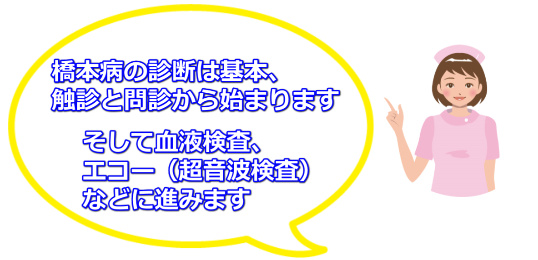 橋本病の診断方法は、まず甲状腺を触ったり超音波で甲状腺の腫れを確かめます。