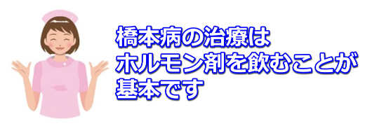 バセドウ病のように手術や放射線治療など複数の選択肢があるわけではなく、甲状腺ホルモン剤(主にチラーヂンSRやレボチロキシンR)を内服することが標準治療となります。