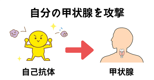橋本病のような自己免疫疾患は、自分の体の中にできた「自己抗体」が、外部からきた細菌などの敵ではなく、甲状腺を敵だとみなして攻撃することで起こります。
